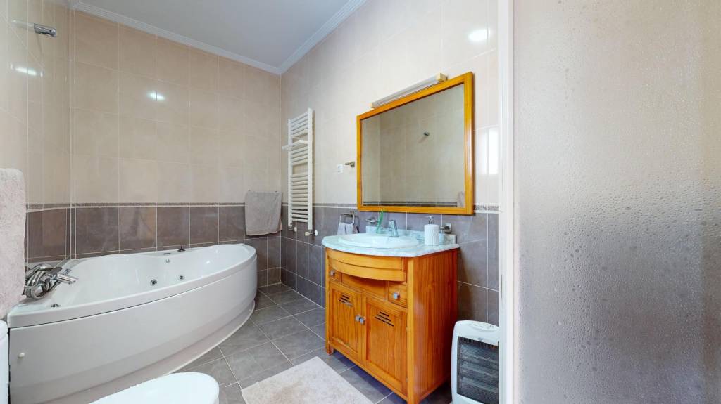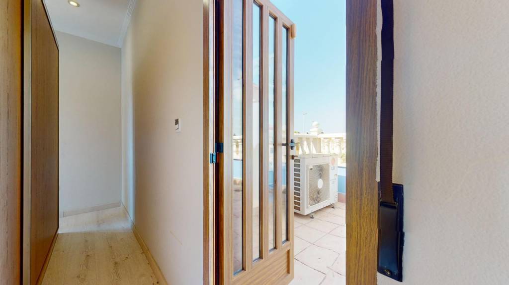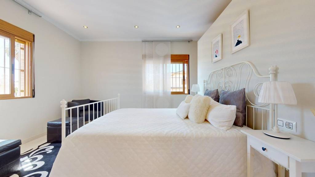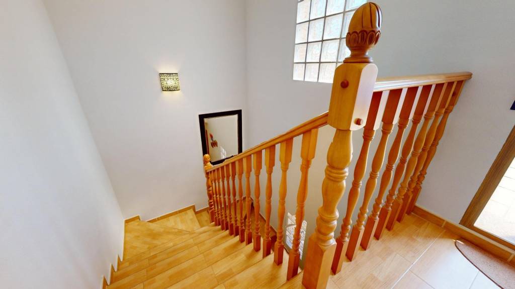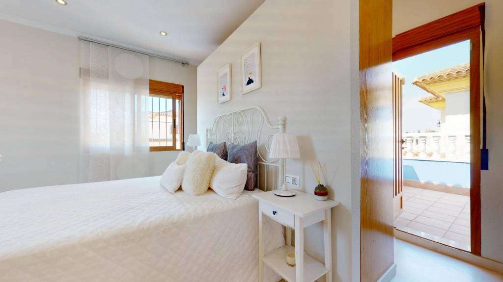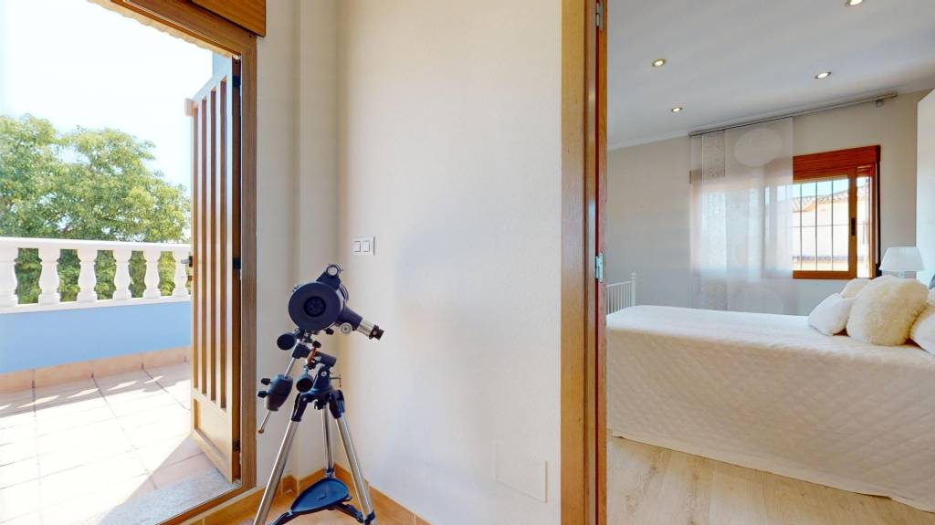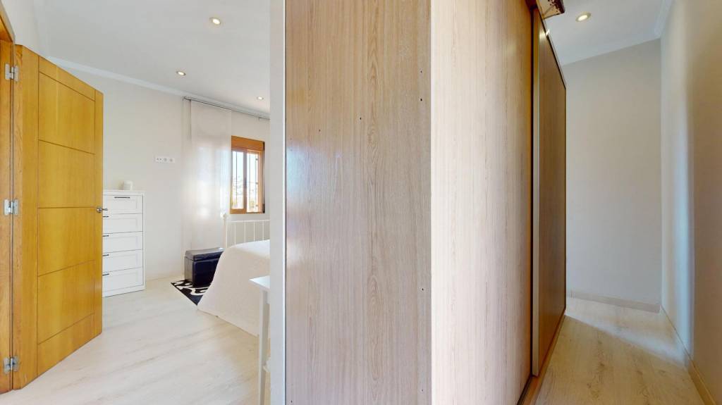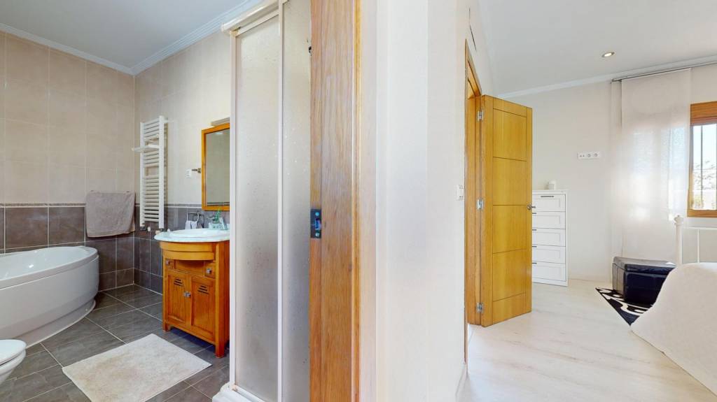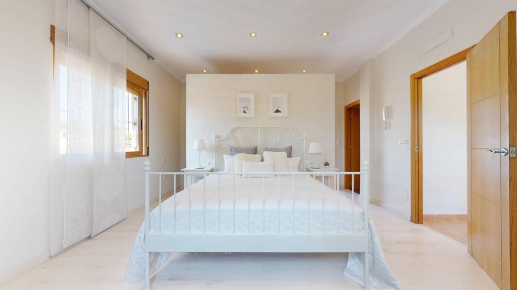 En la planta alta, encontramos el dormitorio principal, que además cuenta con un vestidor y un espacioso baño con una relajante bañera de hidromasaje. En esta misma planta disfrutarás de dos terrazas privadas, una de ellas orientada hacia el levante y rodeada de zonas verdes, perfectas para relajarse al aire libre.